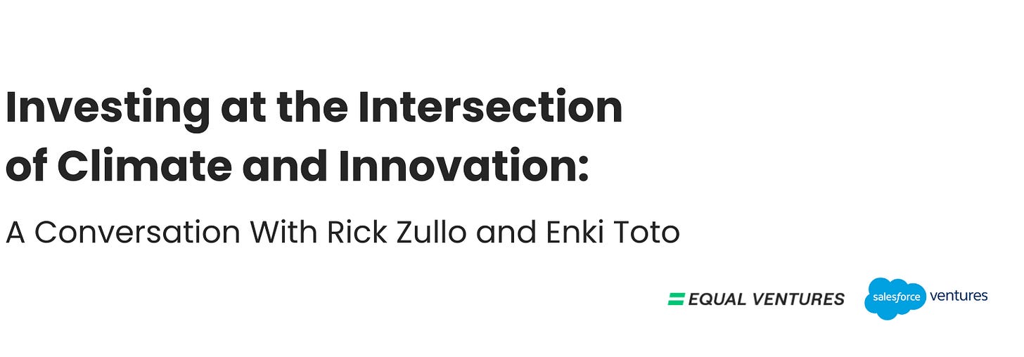 To get a sense of this evolving landscape, we brought together two leading voices in the space for a conversation: Enki Toto, a Principal at Salesforce Ventures, and Rick Zullo, Founder and Managing Partner of Equal Ventures. They explored the forces making climate tech a core focus for their firms, the surprising role of AI in accelerating climate solutions, and what keeps them energized in the face of political and market headwinds. The following is a peek into their conversation and how they’re thinking about shaping the future of climate innovation.