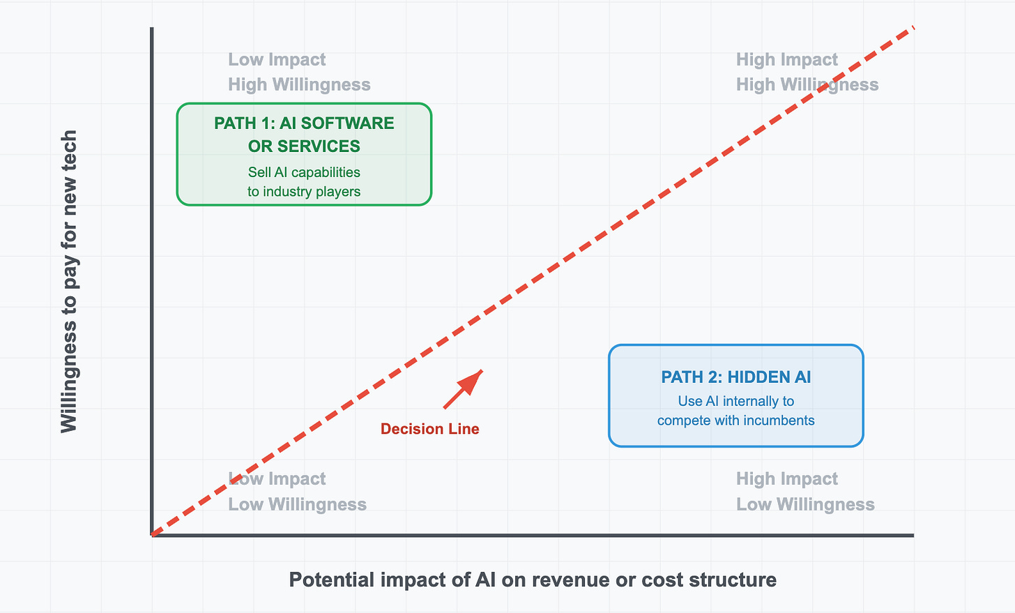 The chart shows a simple breakdown: If customers have high willingness to pay for AI solutions, sell them AI software or services. If customers are resistant to pay or adopt solutions and the impact can be high, consider ingesting AI to compete head on.