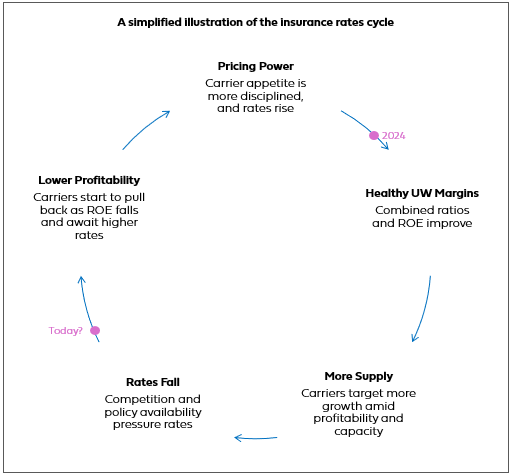 In 2024, we wrote about the shifting insurance rate cycle, from a decidedly hard market into a period of renewed growth and profitability. Since then, rate increases have moderated, new MGAs and carriers have entered the market, and carrier spend on advertising and growth recovered from depressed levels.