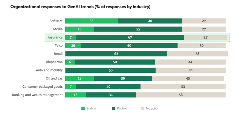 Insurance is fundamentally a finance business: access to a balance sheet or capacity drives the ability to write and scale policies profitably. But at a moment when there is excess (and increasing) capital flowing into the industry, an outsized share of competitive advantages will derive from operational effectiveness rather than from access to capital. Automation and the infrastructure transformation that underpins it are becoming even more important as new underwriters enter the market and rates face pressure. A survey by BCG (shown below) suggests that the insurance industry is already ahead of the curve in “piloting” GenAI compared to other non-technology industries.