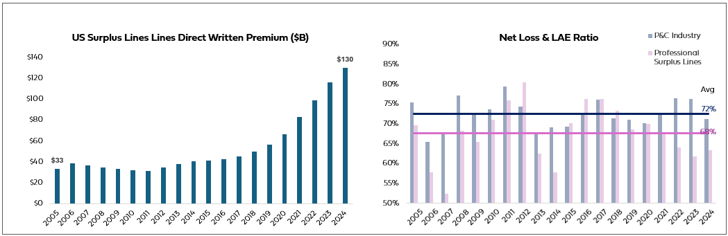 As reinsurers look for more opportunities to deploy capital, MGAs will offer them the fastest opportunity to do so. Underwriters focused on traditionally high-loss categories and E&S will continue to be appealing, because of the opportunity for tech leverage and because there is generally less competition in those segments. As shown in the charts below, surplus lines have grown fourfold over the past twenty years, and in some lines have outperformed the broader admitted P&C market on losses.