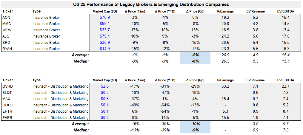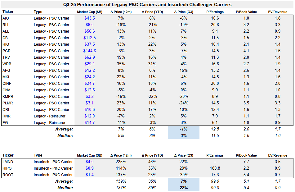 P&C stocks generally underperformed the strong equity market in Q3. Legacy brokers in our index fell by a median of 6% and carriers were up by 3%, compared to SPX +8%