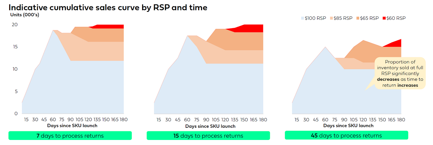 In this era of steep discounts, that lost time off “shelves” is a massive problem for brands. Retail margins decline precipitously over time along the discount curve, not even including the aforementioned logistics costs associated with returns. As the graphics below show, the longer return times results in more discounting and higher return rates and steeper discounting curves exacerbate this dynamic. It’s no surprise that Asos, a major fast fashion retailer with persistent discounting, noted in their last earnings statement that “elevated returns are expected to drive higher levels of markdown and a continuation in the negative impact of returns on product mix.” If not already clear, returns have long been a massive problem for BOTH the top and bottom line. As early as 2018, Revolve spent $531M on returns after accounting for processing costs AND lost sales, but only put up $499M in topline sales as reported by Vogue Business.