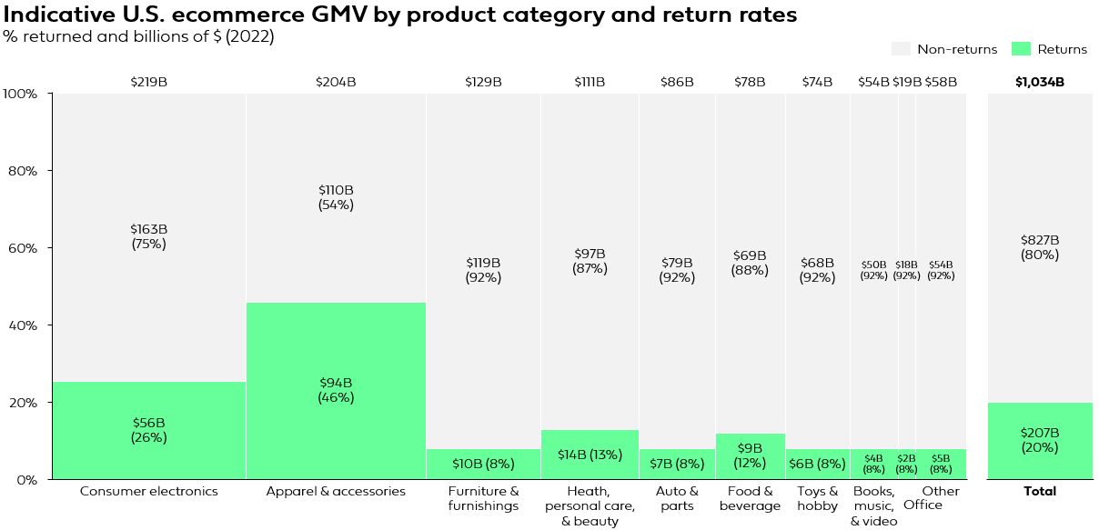 The two biggest categories within ecommerce, apparel and electronics, make up ~40% of overall ecommerce sales and have by far the worst return rates - almost 50% of U.S. consumers have returned an item within apparel within the last 12 months. As Tony Sciarrotta, executive director of The Reverse Logistics Association said in an interview to Retail Dive, “The bedroom is now our dressing room, or the living room is now our dressing room for products we buy, clothing especially.” The analysis below suggests that almost $100B of GMV in apparel ALONE is likely to be returned in 2022.