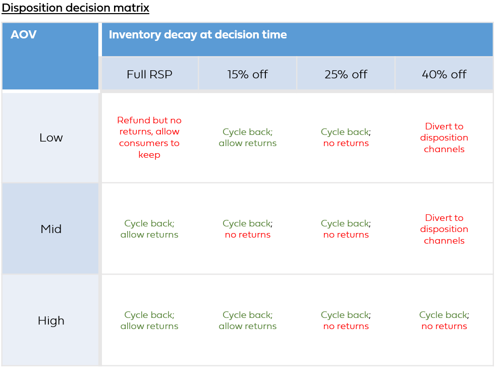 At its core, the returns decision is a math equation. Sophisticated retailers like Amazon, Walmart, and Target now will issue refunds and simply let consumers keep low AOV SKUs because they know the return costs outweigh the potential value of that item being sold again. Shein, the master of dirt cheap fast fashion, employs a similar strategy. At any specific moment in time, depending on where a product is in the discount curve (which is a function of “Days since SKU launch”) and the cost structure of a particular brand’s return infrastructure, there is a profit-maximizing decision. While the status quo is for brands to return items to their warehouse, we’ve found that other disposition options may indeed be more economical.